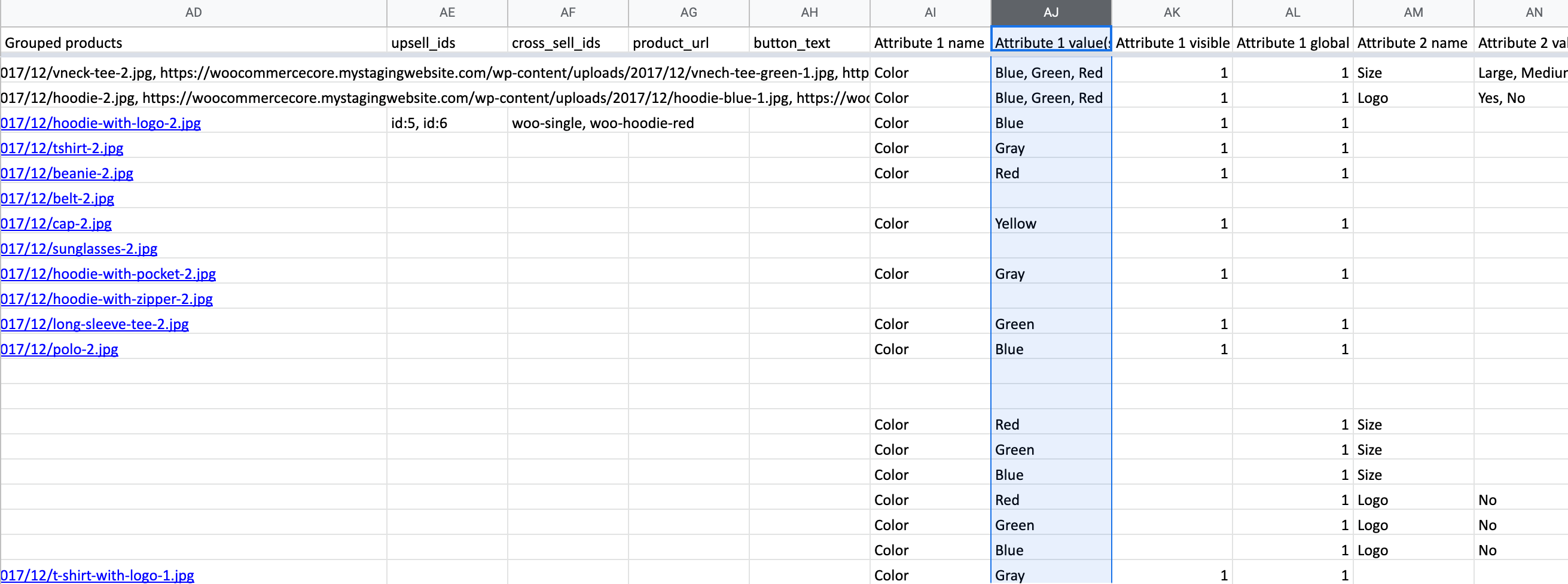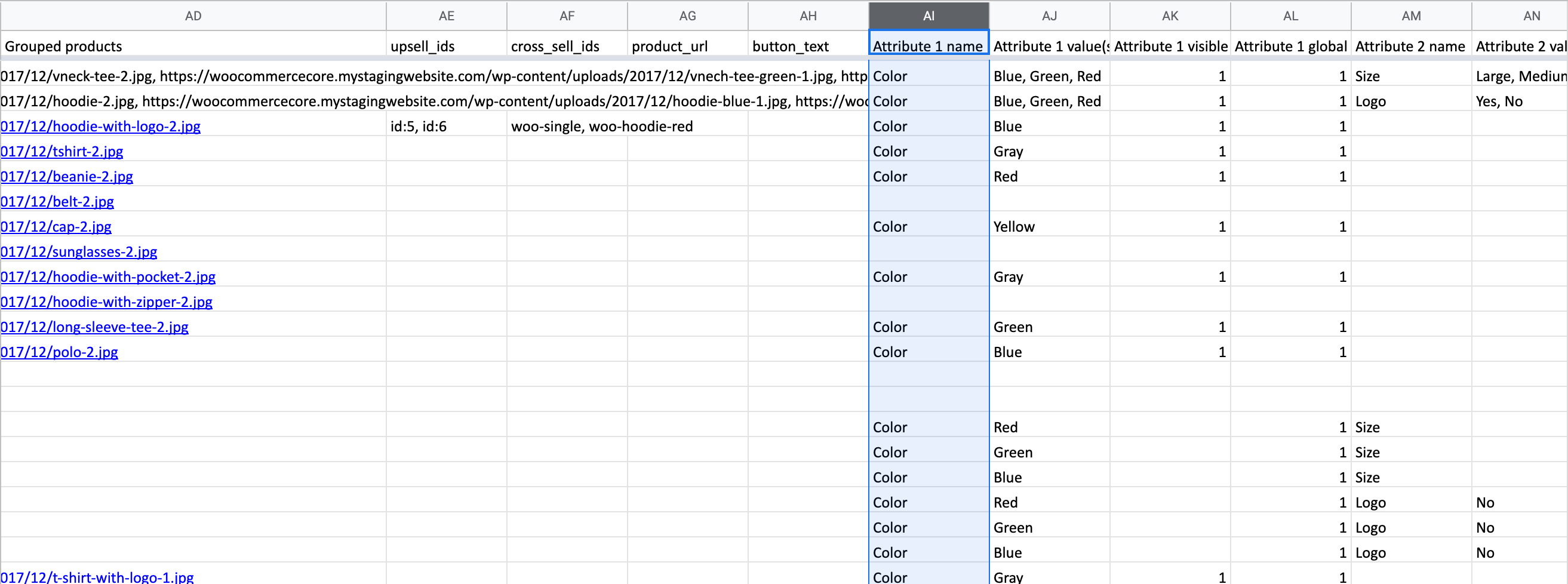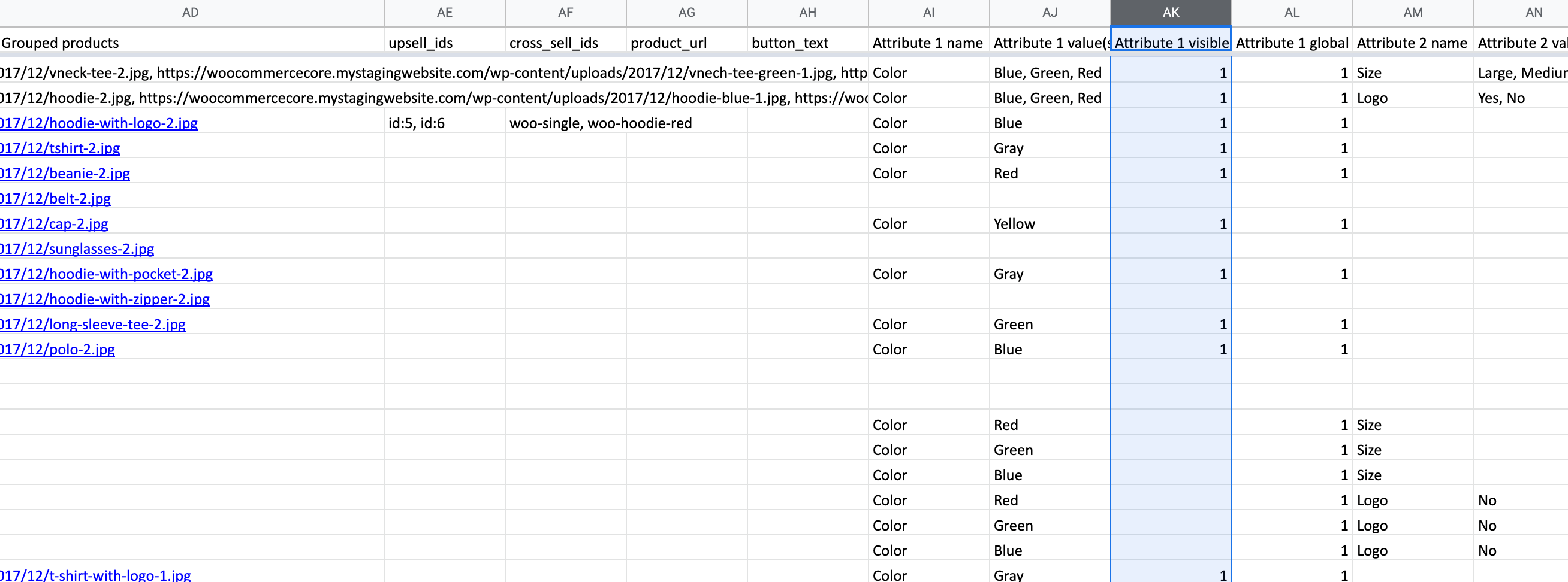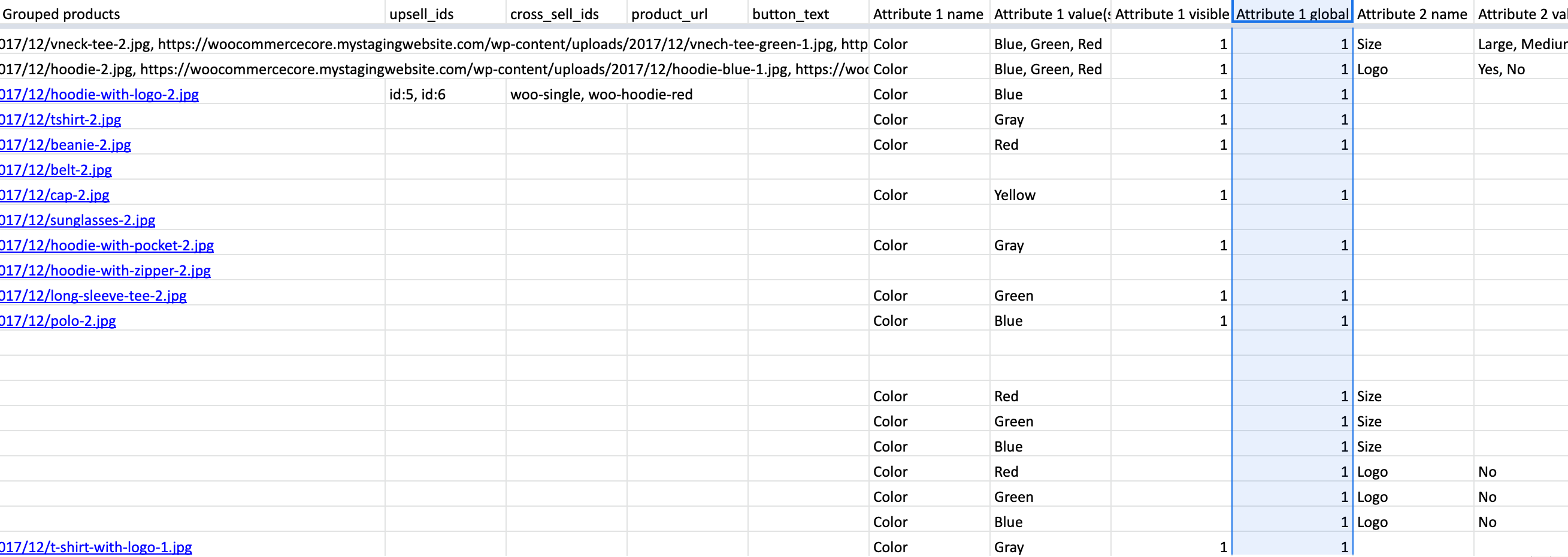 The attribute value of the variable. The attribute value number must match the corresponding attribute name. For example if ‘Attribute 1 name’ is for colors, then ‘Attribute 1 value(s)’ should have color values. If you want to add a second attribute for size you would need to create a second column titled ‘Attribute 2 name’ and a corresponding ‘Attribute 2 value(s)’.