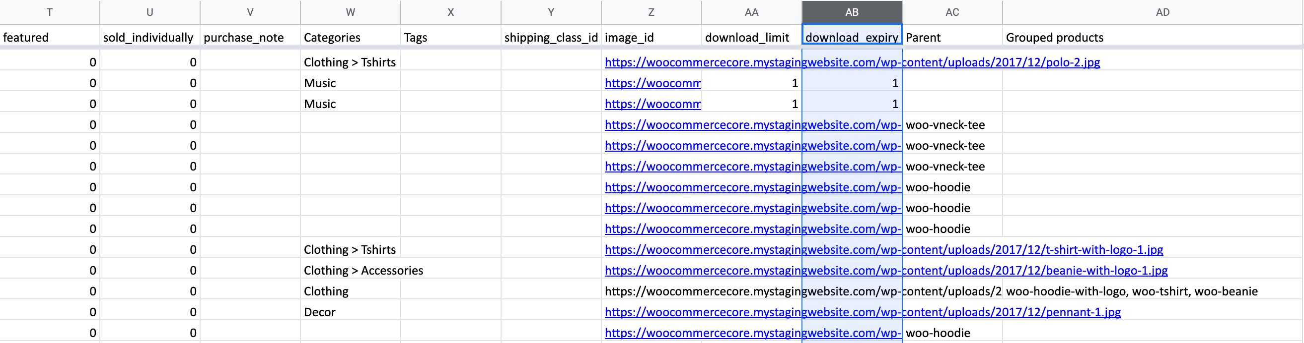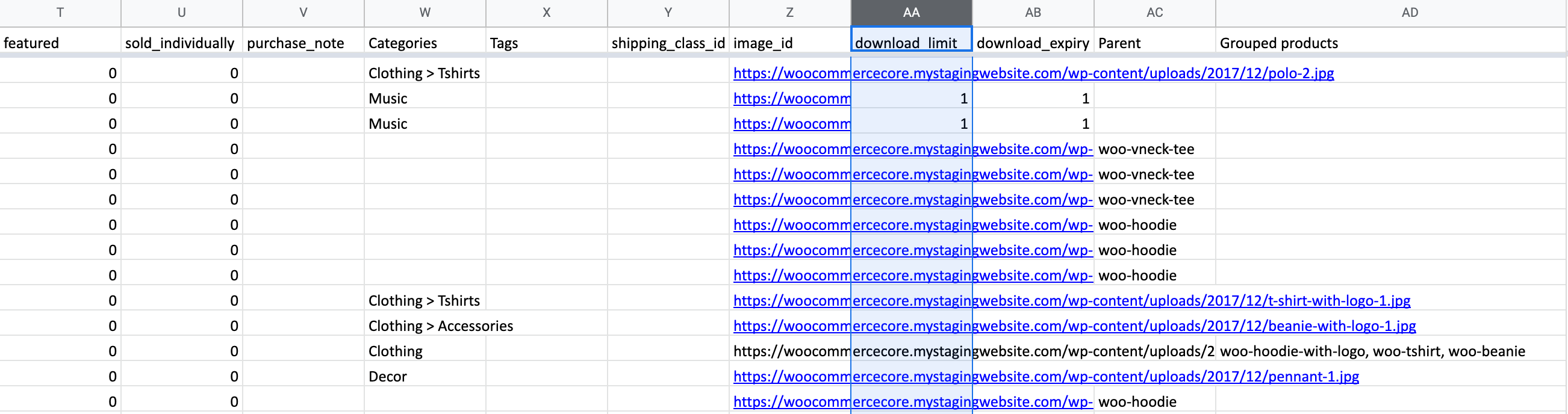 If you have multiple downloadable files, your second download will have the column name Download 2 URL, and so on.