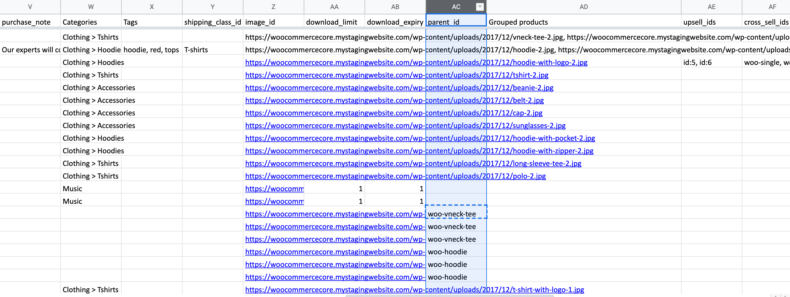 Set parent ID. Used for variations. Can be just a numeric ID e.g. id:100 or a SKU. Export will use SKU when possible.